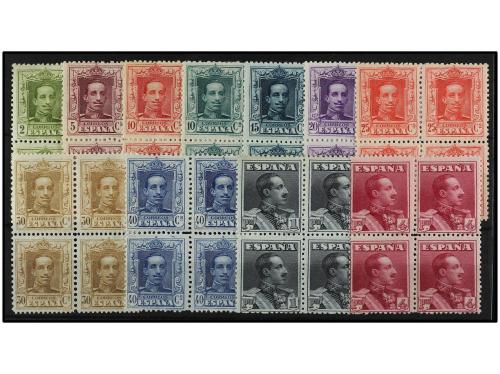 ** ESPAÑA. Ed. 310/22 sin 320 (4). SERIE hasta el 4 pts. a falta del 50 cts. en bloques de cuatro. 11 valores. Mayoría muy bien centrados. A EXAMINAR. Cat. +2.500€.
