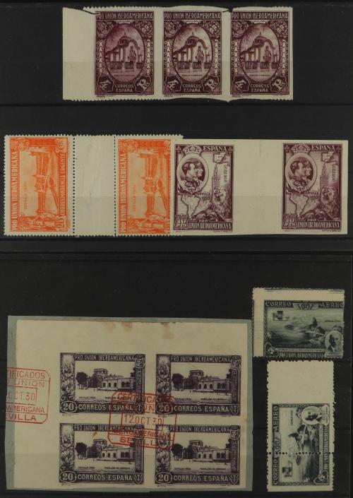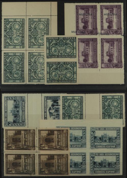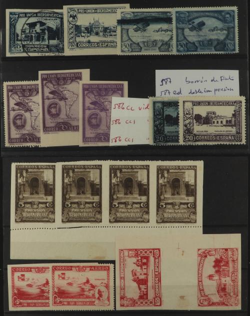 */** ESPAÑA. Ed. 580, 583, 586. IBEROAMERICANA. CONJUNTO de variedades en fichas. Incluye cambios color, muestras, variedades, interpanel, etc. EXAMINAR.