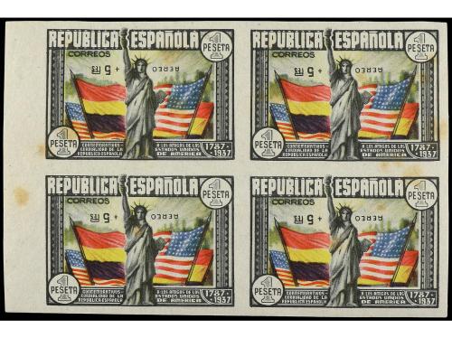 ** ESPAÑA. Ed. 765s. Aéreo + 5 pts. multicolor. Bloque de cuatro SIN DENTAR y SOBRECARGA INVERTIDA. Manchas del tiempo. Firma ROIG.