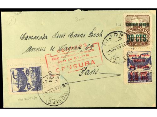 ESPAÑA: ASTURIAS Y LEON. Ed. 7, NE2 y NE12. 1937. Carta supuestamente circulada de GIJÓN (5 Oct. 1937) a PARÍS. Marq. RONALD SHELLEY. RARA. A EXAMINAR.