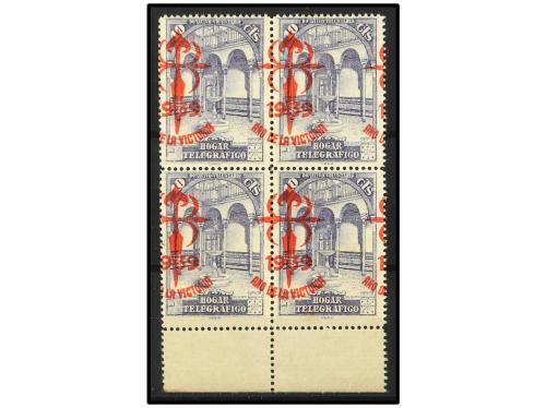 ** ESPAÑA: BENEFICENCIA. HUERFANOS TELEGRAFOS. Ed. 21hdh(4). 10 cts. azul en bloque de 4 con HAB. MUY DESPLAZADA.