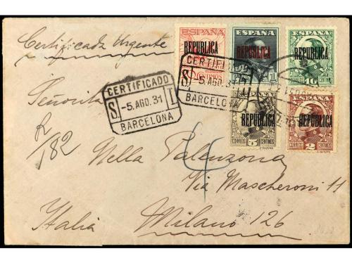ESPAÑA E. LOCALES REPUBLICANAS: BARCELONA. Ed. 6/7, 9 y 16/7. Carta de BARCELONA a MILAN por correo certificado y urgente, enviada el 5 Ago. 1931 y llegada el día 7. MUY RARA.
