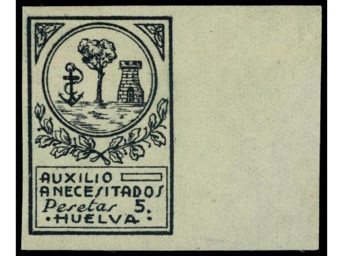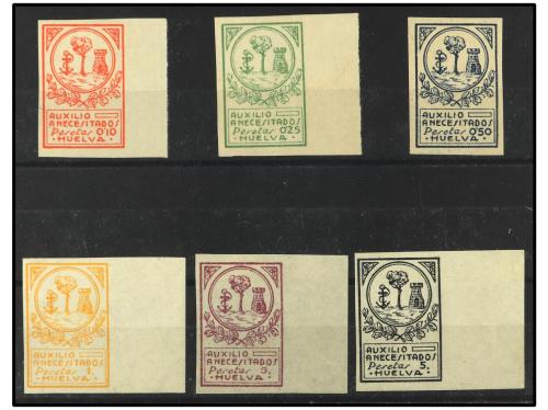 * ESPAÑA GUERRA CIVIL. So. 13/6 y 18/9. HUELVA. AUXILIO A NECESITADOS. 10 cts. a 1 pta., 3 pts. y 5 pts. Siete valores diferentes (6 con borde de hoja). No catalogados SIN DENTAR. MUY RAROS.