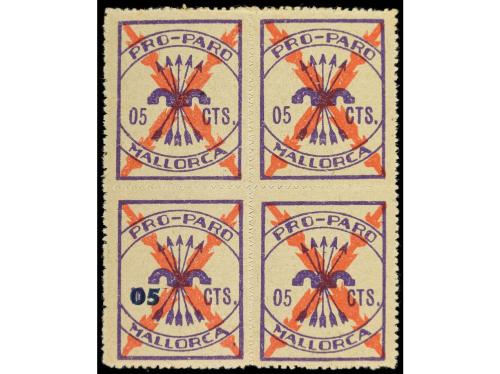 ** ESPAÑA GUERRA CIVIL. PALMA DE MALLORCA. Sello de Pro-Paro de 5 cts. Bloque de cuatro con el error "10" corregido a "05".