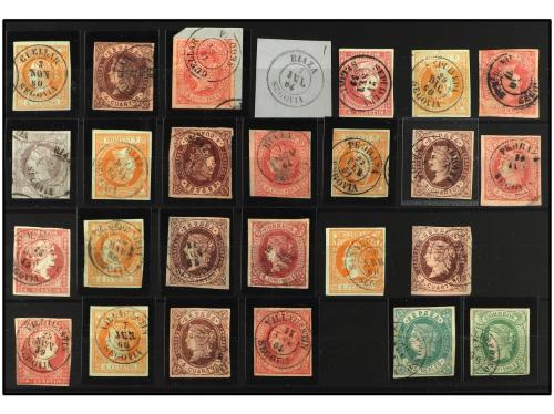 ° HISTORIA POSTAL. SEGOVIA. 1856-1864. Conjunto de 22 sellos de 4 cuartos con matasellos T. II de poblaciones de la provincia (CUELLAR, PEDRAZA, Mª DE NIEVA, etc...), la mayoría con buenas estampaciones, a destacar los de VILLACASTIN (por su rareza). Se incluyen 3 sellos más nº 56, 62 y 65 con Mat. RIAZA y S. YLDEFONSO respectivamente. PRECIOSO. RARO.