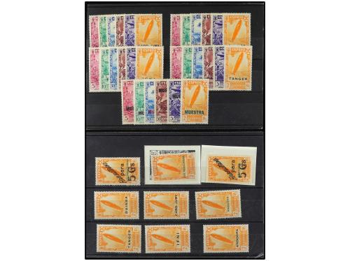 ESPAÑA. FICHAS conteniendo las series de Beneficencia: España, * 21/6M (sombras del tiempo), Cabo Juby ** 12/7, Guinea ** 12/7, Ifni 7/12, Tánger ** 6/11 y otros sueltos. Cat. 375€.