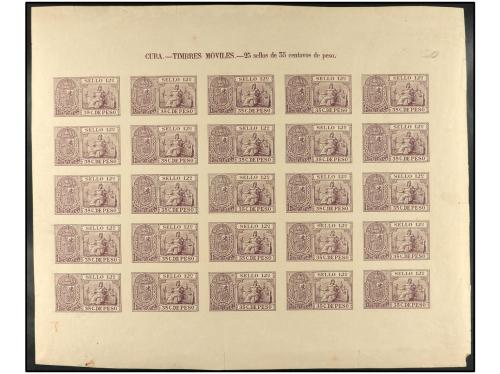 COLONIAS ESPAÑOLAS: CUBA. 1899. TIMBRES MOVILES de 35 c. de peso. Sello 12º. Espectacular pliego completo de 25 ejemplares con goma original tonalizada. MUY RARO. A EXAMINAR.