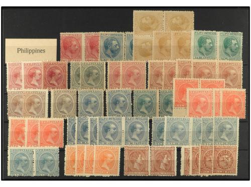 ** COLONIAS ESPAÑOLAS: FILIPINAS. 1880-1897. Ficha grande conteniendo sellos sueltos repetidos en pequeña cantidad. Hay parejas y un bloque de 4. OCASION. A EXAMINAR. Yvert 710€.