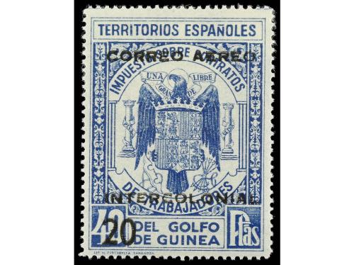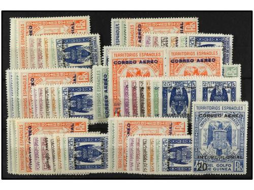 COLONIAS ESPAÑOLAS: GUINEA. 25 cts. a 20 pts. sobre 40 pts. 9 valores. Habilitación privada, CORREO AÉREO / INTERCOLONIAL. 7 series, una con fijasellos. Galvez **/* A1/A9.