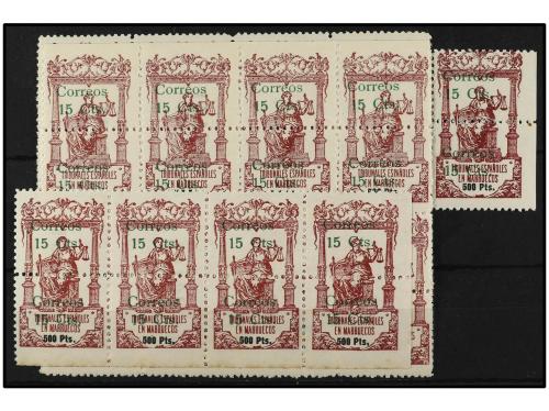 ** COLONIAS ESPAÑOLAS: MARRUECOS. Ed. 73. 15 c. sobre 500 pts. 37 sellos en bloques. Cat. 2.035€.