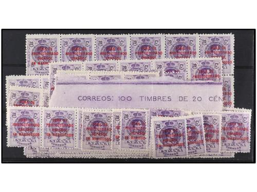 ** COLONIAS ESPAÑOLAS: MARRUECOS. Ed. 75 (125). 20 cts. violeta. 125 ejemplares sueltos, parejas y bloques. Centrados diversos. EXAMINAR. Cat. 3.125€.