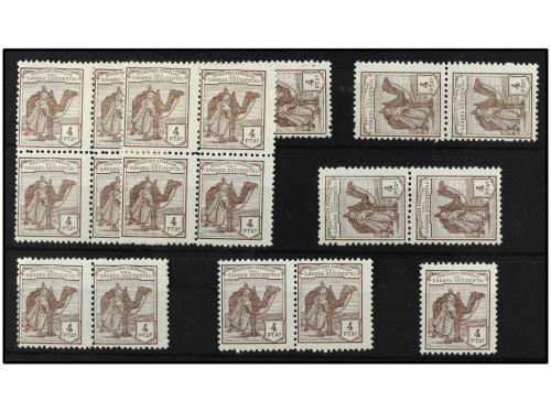 ** COLONIAS ESPAÑOLAS: SAHARA. Ed. 11N (20). 4 pts. castaño. 20 sellos sueltos y en tiras o bloques Numeración ceros. Buena calidad. Cat. +2.800€.