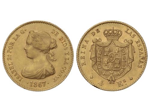 ISABEL II. 4 Escudos. 1867. MADRID. 3,34 grs. (Golpecito en gráfila). AC-691. EBC-.