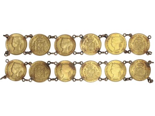 ISABEL II. Lote 6 monedas 1 Peso. 1861 (2), 64, 66, 68 (2). MANILA. Peso total 11,22 grs. Engarzadas en pulsera. AC-820 (2), 826, 830, 833 (2). MBC-.