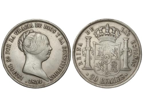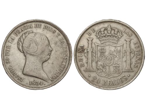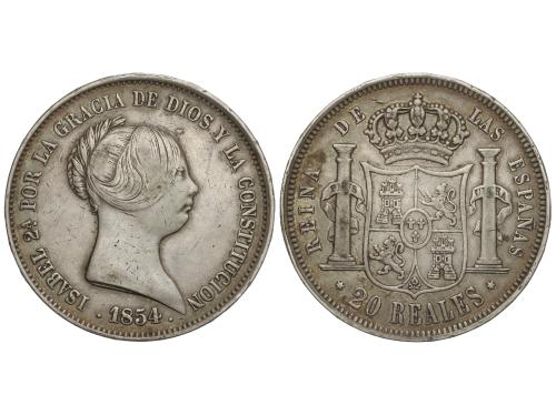 ISABEL II. 20 Reales. 1854. MADRID. 25,51 grs. (Pequeños golpecitos). Pátina. AC-596. MBC-/MBC.