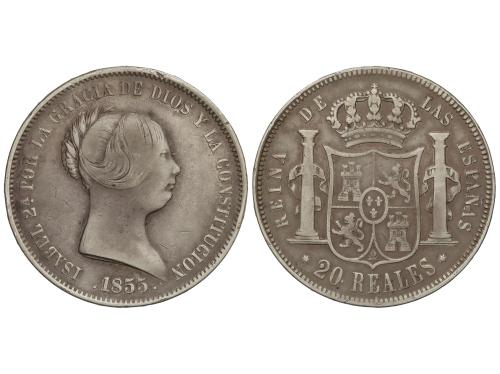 ISABEL II. 20 Reales. 1855. MADRID. 25,52 grs. (Pequeñas rayitas). Pátina. AC-597. MBC-.