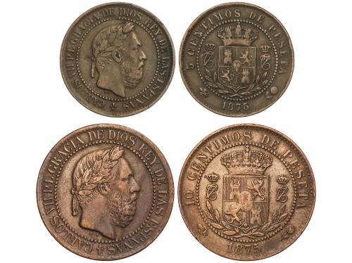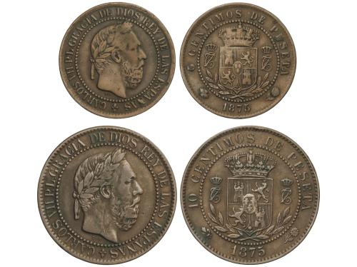 CARLOS VII Pretendiente. Lote 2 monedas 5 y 10 Céntimos. 1875. BRUSELAS. O.T. Anverso y reverso coincidentes. Tipo medalla. AC-3, 6. MBC+.