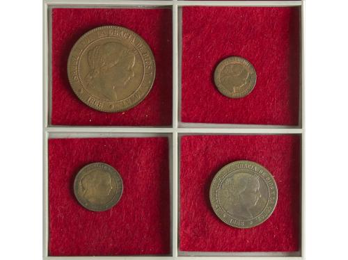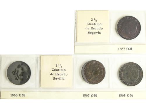 ISABEL II. Lote 4 monedas 2-1/2 Céntimos de Escudo. 1867 y 1868. SEGOVIA (2) y SEVILLA (2). O.M. A EXAMINAR. AC-240/43. MBC a MBC+.