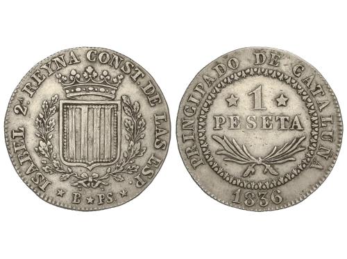 ISABEL II. 1 Peseta. 1836. BARCELONA. P.S. 5,64 grs. Canto estriado. AC-271. EBC-.