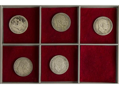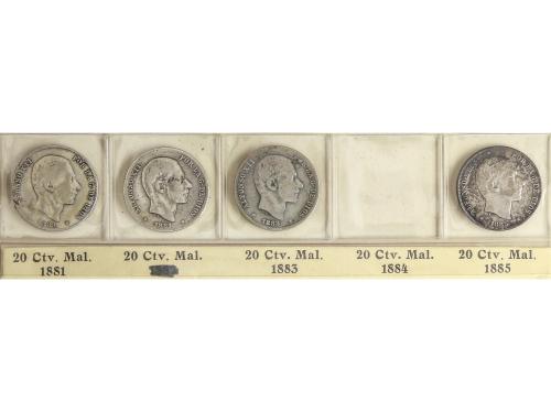 ALFONSO XII. Lote 5 monedas 20 Centavos de Peso. 1881, 1882, 1883, 1884 y 1885. MANILA. BC+ a MBC.