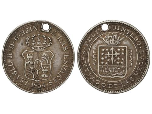 ISABEL II. Medalla proclamación. 1834. SANTIAGO DE LAS VEGAS. 6,67 grs. Ø 25 mm. (Perforación). ESCASA. He-55. MBC.