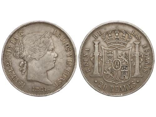 ISABEL II. 20 Reales. 1861. MADRID. 25,64 grs. (Rayitas y golpecitos en canto). Pátina. AC-619. MBC.
