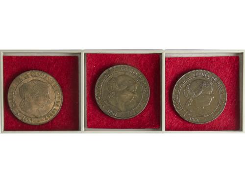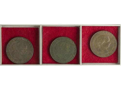 ISABEL II. Lote 3 monedas 5 Céntimos de Escudo. 1867 y 1868. BARCELONA. A EXAMINAR. AC-244/46. MBC- a MBC+.