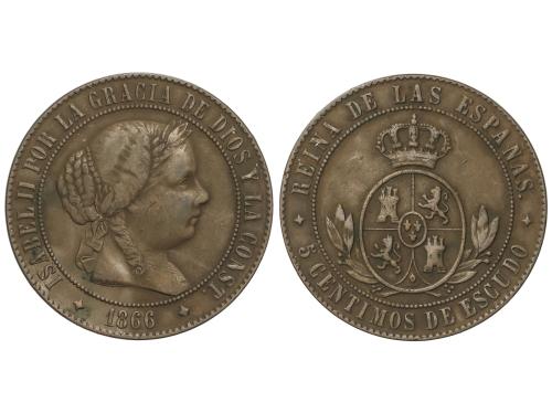 ISABEL II. 5 Céntimos de Escudo. 1866. JUBIA. 12,41 grs. Sin O.M. Pátina. MUY ESCASA. AC-247. MBC.