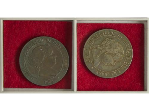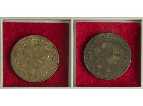 ISABEL II. Lote 2 monedas 5 Céntimos de Escudo. 1867 y 1868. JUBIA. O.M. AC-248, 249. MBC- y MBC.