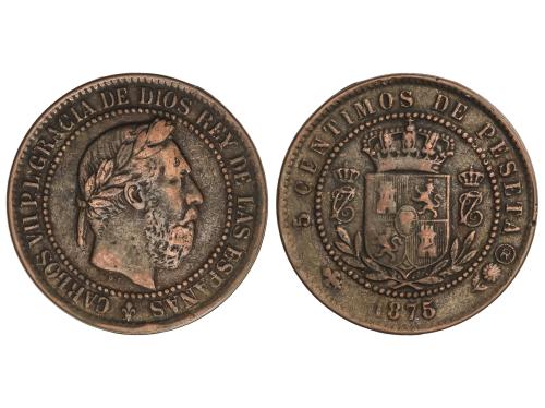 CARLOS VII Pretendiente. 5 Céntimos. 1875. BRUSELAS. O.T. Anverso y reverso coincidentes. Tipo medalla. AC-3; HG-16. MBC+.