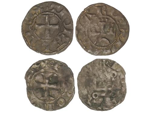 REINO DE NAVARRA. Lote 2 monedas Dinero y Carlín Negro. TEOBALDO II y CARLOS EL MALO. Anv.: El dinero de Teobaldo: TIOBALD´ REX. Cruz interior; el carlin negro de Carlos el malo: +:K(A)ROLVS REX. Cruz interior. Rev.: El dinero de Teobaldo : +DE NAVARIE:. Castillo esquemático y creciente.; el carlin negro de Carlos el malo: +:DE:NAVA(RR)A. Castillo tornés. 0,82 y 0,88 grs. Ve. Pátina oscura. Cru.VS-228, 236 var. final leyenda reverso; IBL-1, 16; Ros-3.11.1, 3.14.18 sim. (MBC) y MBC-.