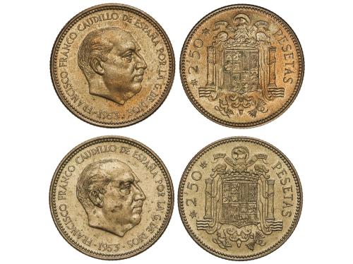 ESTADO ESPAÑOL. Lote 2 monedas 2´50 Pesetas. 1953 (*19-70 y 19-71). Procedentes de tiras F.N.M.T. PRUEBAS.