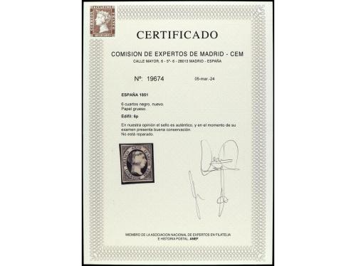 * ESPAÑA. Ed. 6p. 6 cuartos negro con PAPEL GRUESO. Cert. CEM. PRECIOSO. MUY RARO. Cat. 845€.