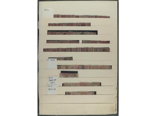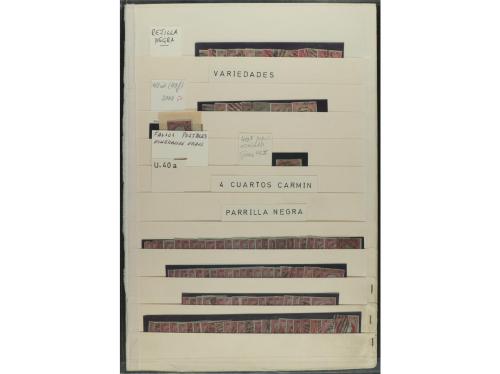 ° ESPAÑA. Ed. 40. 4 cuartos rojo. Hojas clasificadoras conteniendo cientos de sellos con diversos matasellos, tonalidades, etc... OCASION. A EXAMINAR.