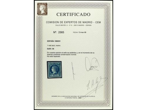 * ESPAÑA. Ed. 55. 1 real azul. Precioso sello por su color y amplios márgenes. Cert. CEM. RARO.