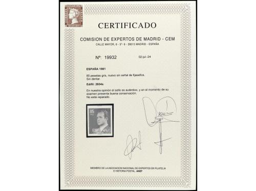 ** ESPAÑA. Ed. 2604s. JUAN CARLOS I. 85 pts. gris SIN DENTAR. Amplios márgenes. Cert. CEM. MUY RARO.