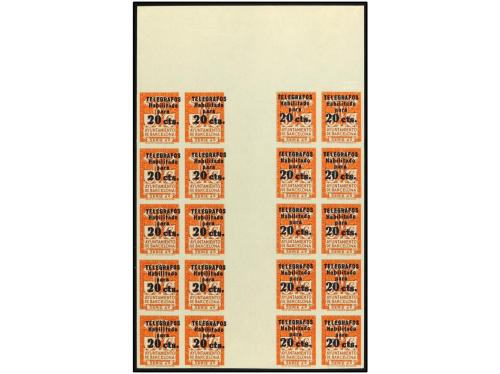 ** ESPAÑA VARIOS. Ed. **T.11(4) y T.11ns(24). TELEGRAFOS. 20 cts. s. 5 cts. naranja y castaño. Bloque de 4 dentado, bloque de 20 SIN DENTAR con INTERPANEL y bloque de 4 SIN DENTAR (ambos SIN NUMERACION). Buena calidad. OCASION. Cat. 2.400€.