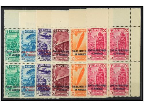 ** COLONIAS ESPAÑOLAS: MARRUECOS. Ed. B.26/31(4). BENEFICENCIA. SERIE COMPLETA en bloque de 4. Todos borde o esquina de pliego. PRECIOSA. OCASION. Cat. 960€.