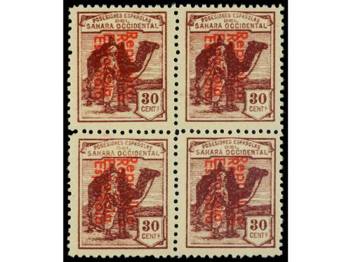 ** COLONIAS ESPAÑOLAS: SAHARA. Ed. 41Ahcc(4). 30 cts. castaño rojizo en bloque de 4 con HAB. DOBLE EN COLOR ROJO. PRECIOSO. RARO. Cat. 1.440€.
