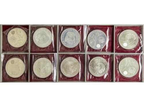 JUAN CARLOS I. Lote 10 monedas 20 Euros. 2010 y 2011. Campeones del mundo (5), Centenario Dia Internacional de la mujer (5). Todas en precintos originales de plástico. SC.