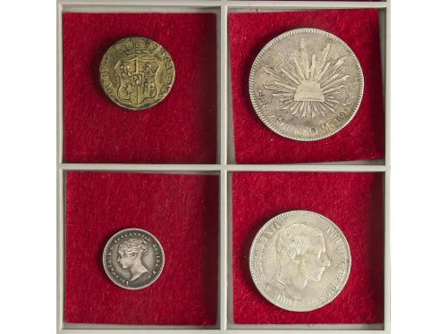 LOTES y COLECCIONES. Lote 3 monedas y 1 Ponderal. AR y latón. Alfonso XII: 50 Centavos Peso 1885, GRAN BRETAÑA: 4 Pence 1843 KM-732, MEXICO: 4 Reales 1852 Zacatecas KM-375.9. Ponderal Doppia Spagna. A EXAMINAR. MBC a EBC-.