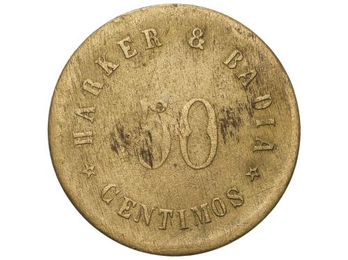 50 Céntimos. Principios de siglo XX. HARKER & BADIA. VALENCIA. Latón. Empresa envasadora y recolectora de fruta. RARA. MBC-.