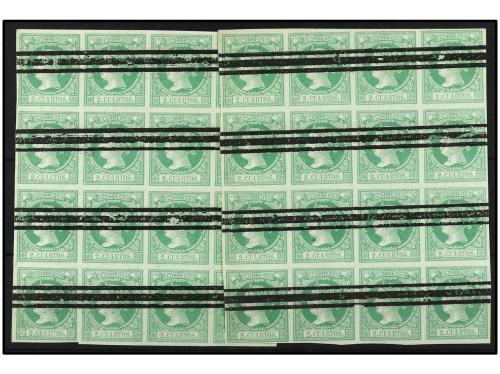 ° ESPAÑA. Ed. 51. 2 cuartos verde. 32 sellos en 2 bloques BARRADOS. Cat. 176€.