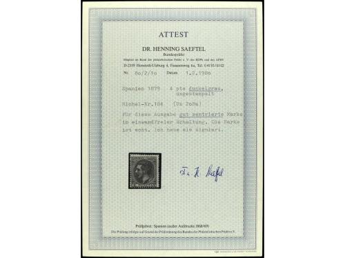 * ESPAÑA. Ed. 208. 4 pts. gris. Espectacular por su color intenso. Dictamen CEM y SAEFTEL. PRECIOSO. MUY RARO. Cat. 1.045€.