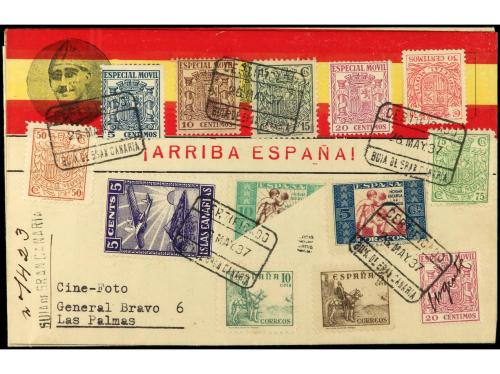 ESPAÑA. Ed. 816, 817, etc... Carta certificada y urgente de GUIA DE GRAN CANARIA a LAS PALMAS con espectacular franqueo de POLIZAS y BENEFICENCIA. Salió el 26 de Mayo y llegó el 27. PRECIOSA. MUY RARA.