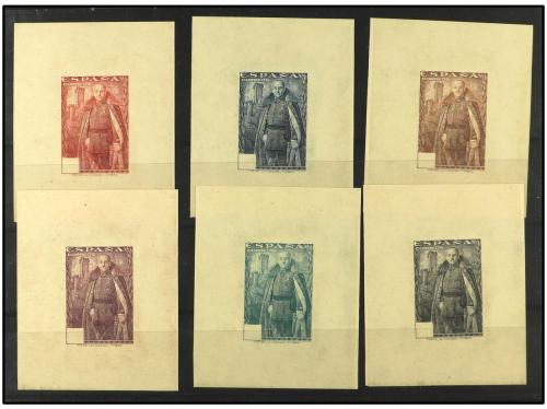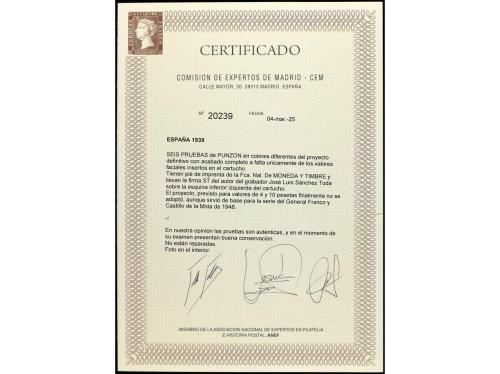 ESPAÑA. 1939. PRUEBAS DE PUNZÓN del proyecto definitivo con acabado completo a falta únicamente de los valores faciales. Tienen píe de imprenta y la firma ST. del grabador. 6 PRUEBAS en colores diferentes. Cert. CEM. Rarísimas y subastadas por primera vez.