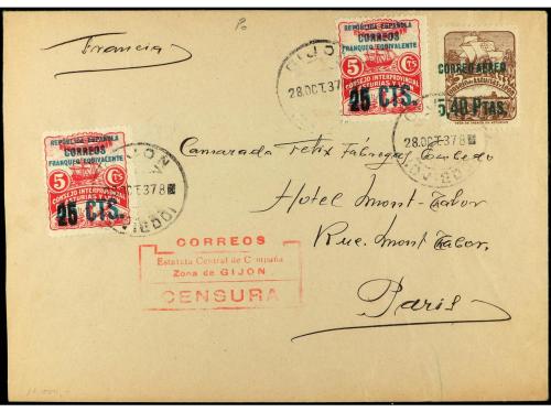 ESPAÑA: ASTURIAS Y LEON. Ed. NE6(2) y NE16. 1938. Carta supuestamente circulada de GIJÓN a PARÍS con los No Emitidos. RARA. A EXAMINAR.