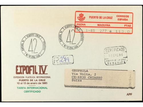 VARIOS. Ed. 1d. 1985. Cinco cartas certificadas en etiquetas de 113 pts. PUERTO DE LA CRUZ con matasellos conmemorativo EXPOFIL IV. Enviadas a SUIZA, llegada al dorso. OCASION.