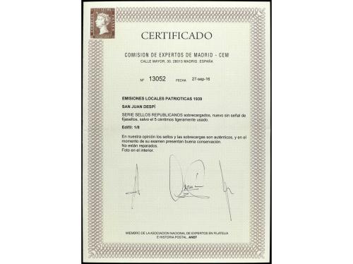 ** ESPAÑA E. LOCALES PATRIOTICAS: SAN JUAN DESPI. Ed. 1/8. SERIE COMPLETA con el 5 cts. ligeramente usado como la mayoría de las auténticas. Cert. CEM. PRECIOSA. MUY RARA.
