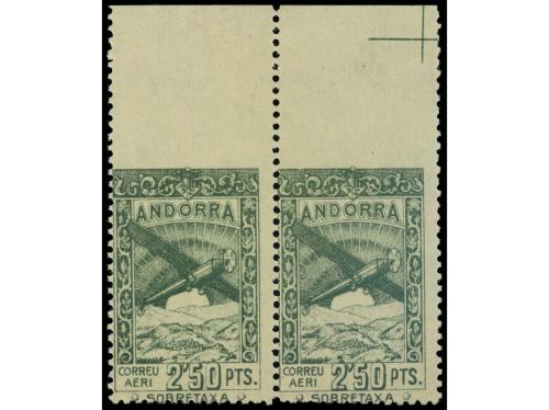 ** ANDORRA. Ed. NE21sma. 2,50 pts. verde en pareja horizontal SIN DENTAR MARGEN SUPERIOR. Borde de hoja. BONITA. RARA. Cat. 200€.